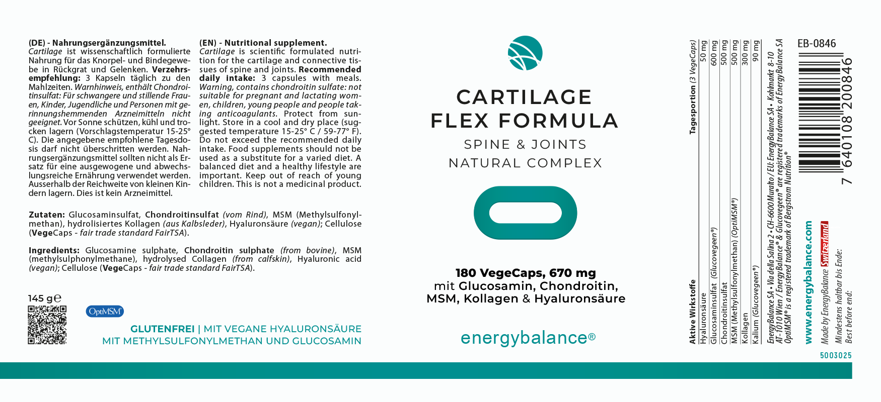 Glucosaminsulfat, Chondroitinsulfat, MSM (Methylsulfonylmethan), hydrolysiertes Kollagen Typ II, Hyaluronsäure. VegeCaps aus Zellulose (aus fairem Handel).