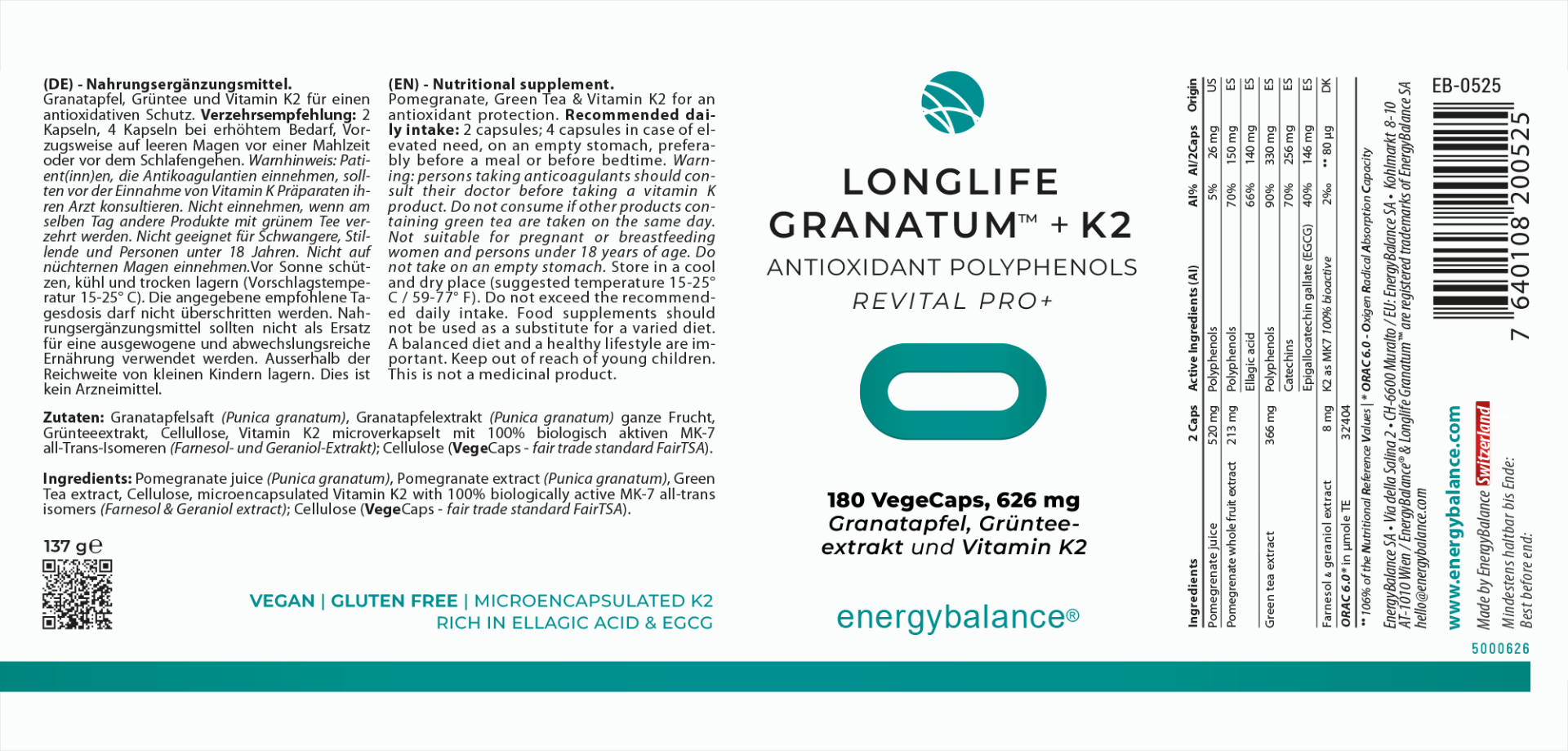 Longlife Granatum wird vollständig in der Schweiz von EnergyBalance® entwickelt, hergestellt und verpackt – gemäß den HACCP-Standards für Lebensmittelsicherheit.