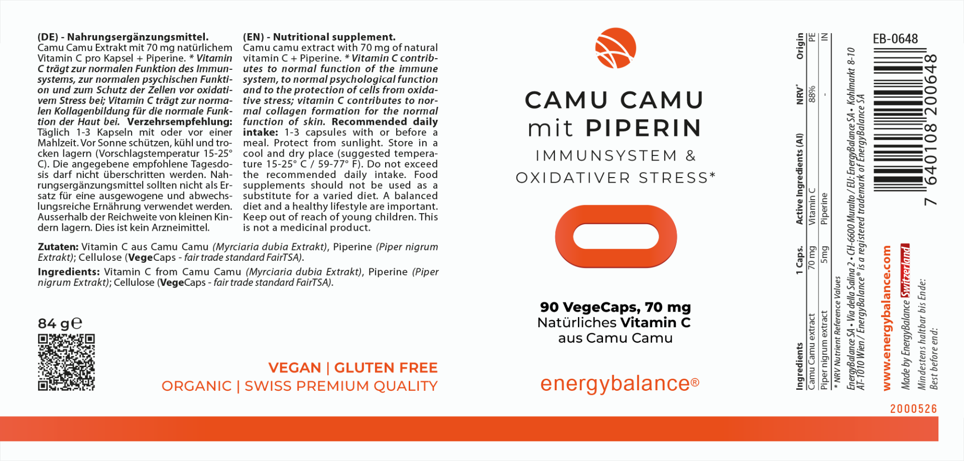 Organic Vitamin C from camu camu (Myrciaria dubia), Piperine (Piper Nigrum), Cellulose (VegeCaps – fair trade standard FairTSA).
