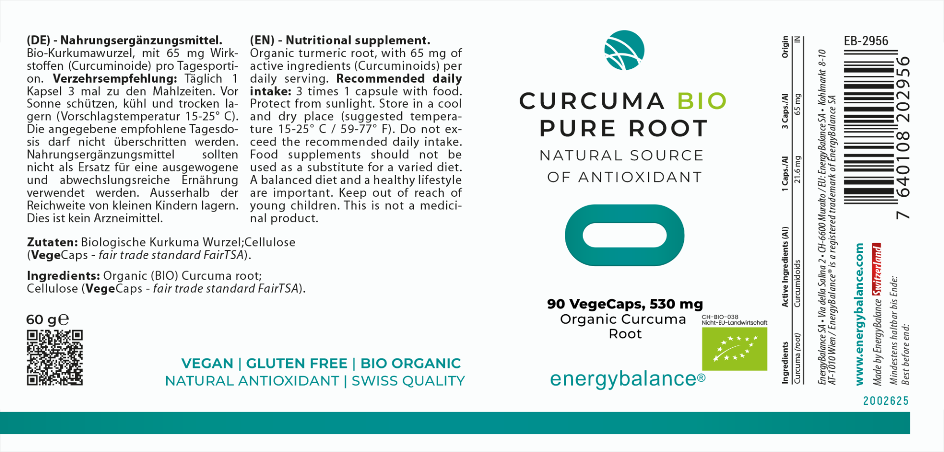 Contents: organic quality: 60g = 90 VegeCaps each containing 530mg