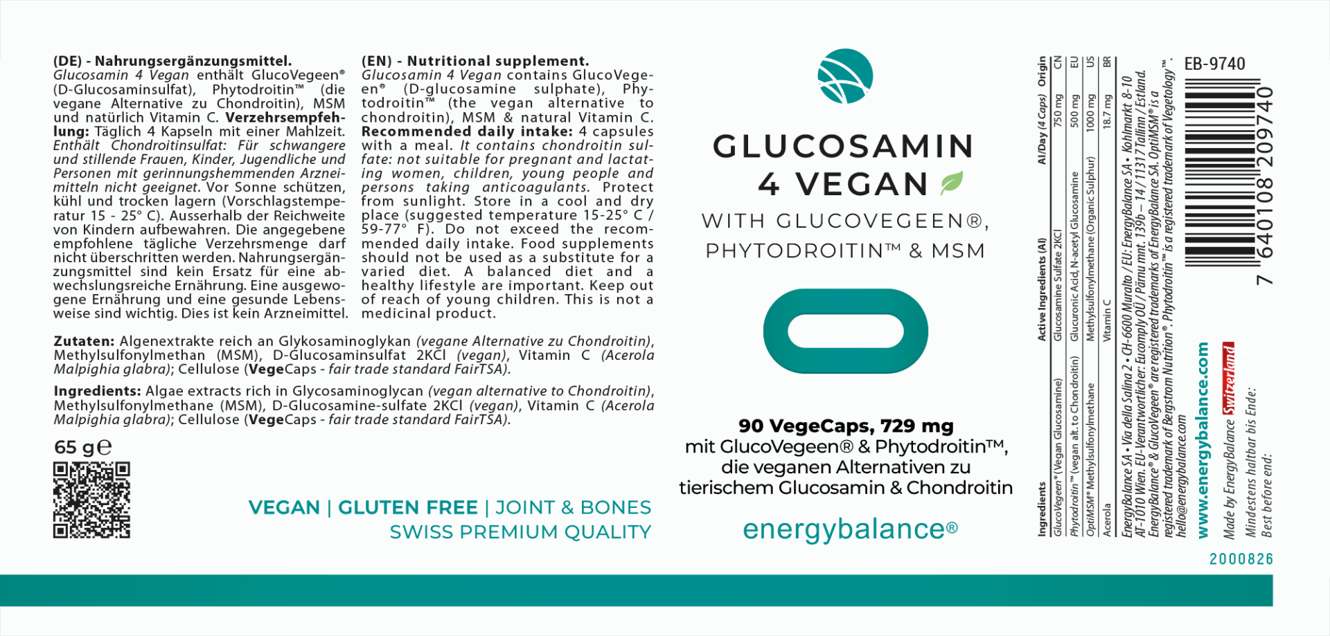 Glucosamine 4 Vegan by EnergyBalance® Switzerland is a 100% plant-based supplement developed to promote the well-being of joints, connective tissue, and cartilage. Unlike most products on the market derived from crustaceans, this formula uses exclusively plant-based and sustainable sources. Contains 90 capsules of 729 mg each.