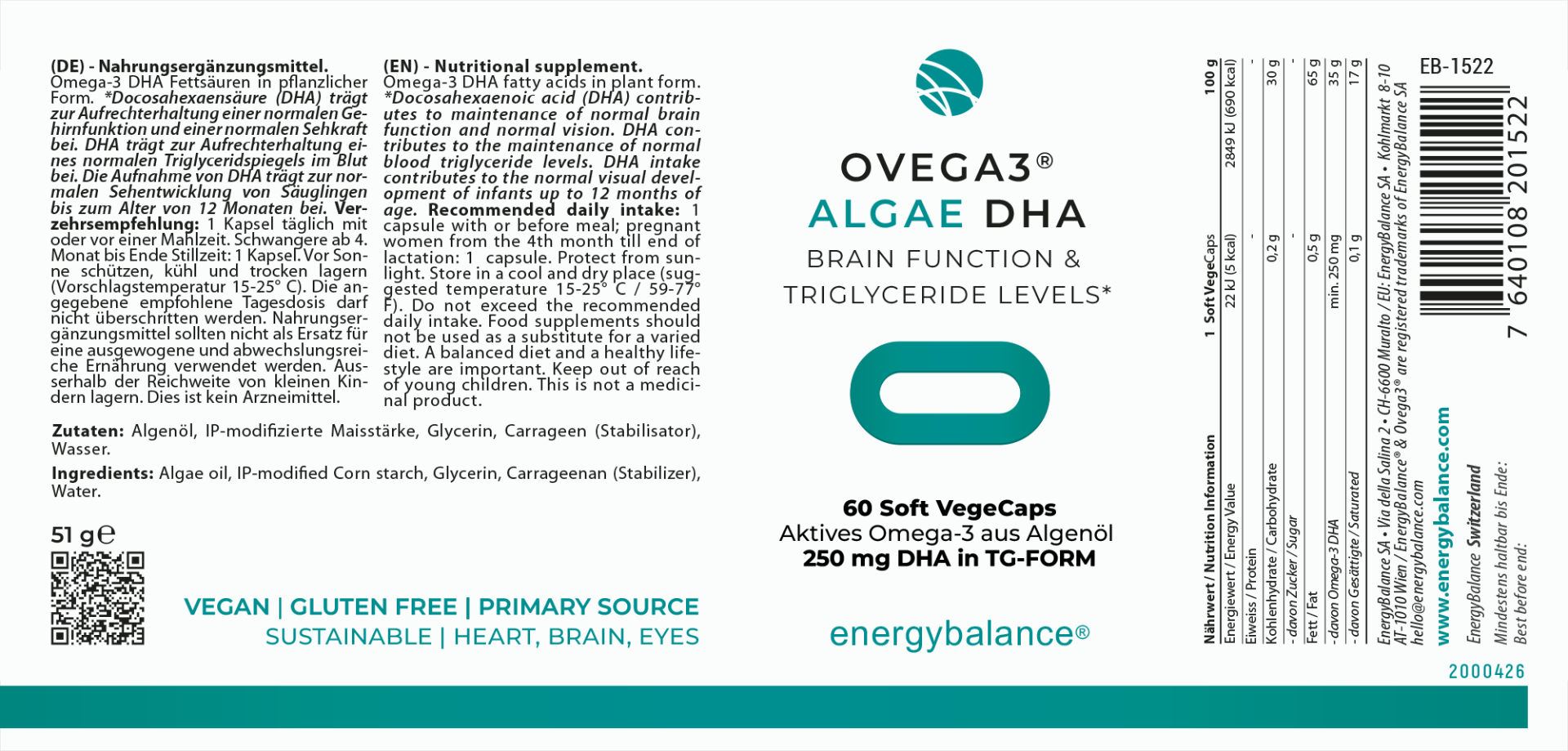Algae oil provides DHA and EPA, long-chain active omega-3 fatty acids essential for proper body function. According to the EFSA (European Food Safety Authority), a daily intake of at least 250 mg of DHA and EPA contributes to the maintenance of: