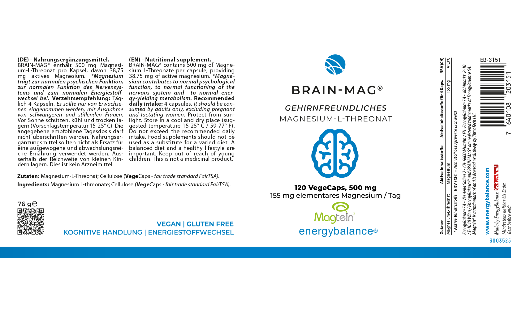 Brain-Mag® is a registered trademark of EnergyBalance SA. Magtein® is protected under a family of US patents, pending patents, and is protected worldwide. Magtein® is a trademark of and is licensed exclusively by ThreoTech LLC.