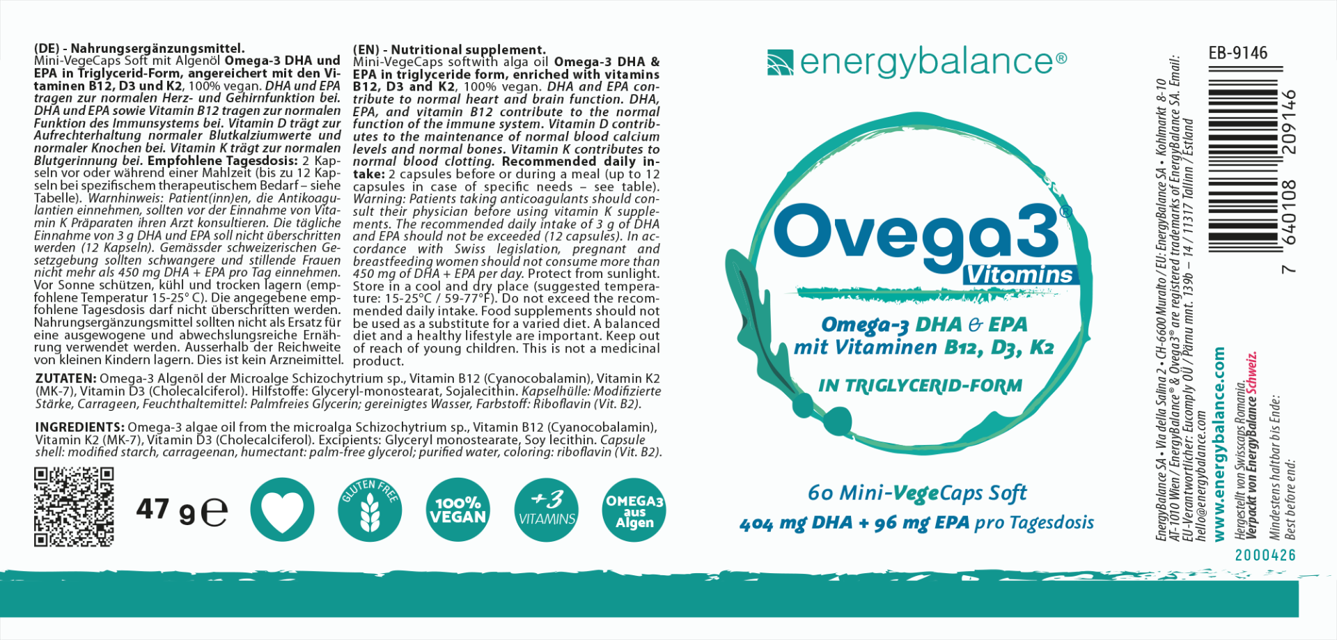 EnergyBalance® Switzerland festeggia 25 anni con un integratore unico e in edizione limitata: Omega-3 in forma TG da alghe con vitamine naturali, confezionati in blister e con scatola din cartole riciclato. Alta qualità svizzera dal 1999.