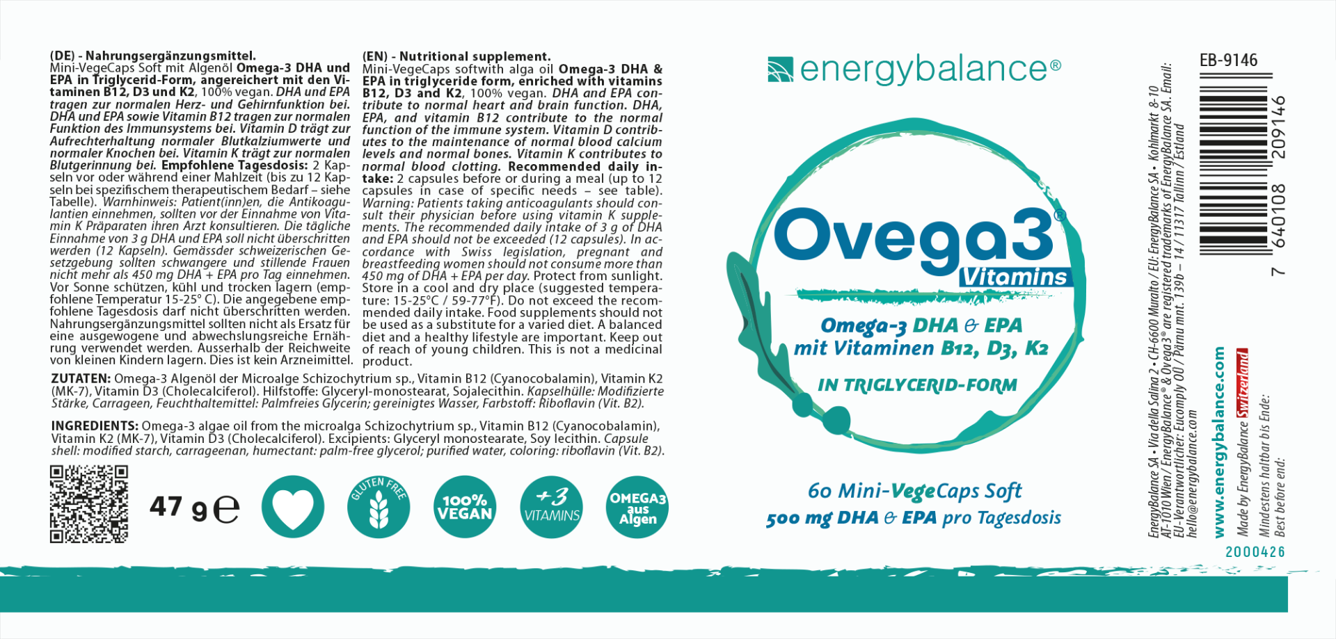 Ogni capsula contiene: 250 mg di acidi grassi attivi in olio di alta qualità e di origine vegetale (da alghe - microalgae Schizochytrium sp.): 202 mg DHA + 48 mg EPA; DPA = 6.25 mg; vitamina B12 = 0.75 μg; vitamina D3 = 1.67 μg; vitamina K2 (MK-7) = 8.33 μg.