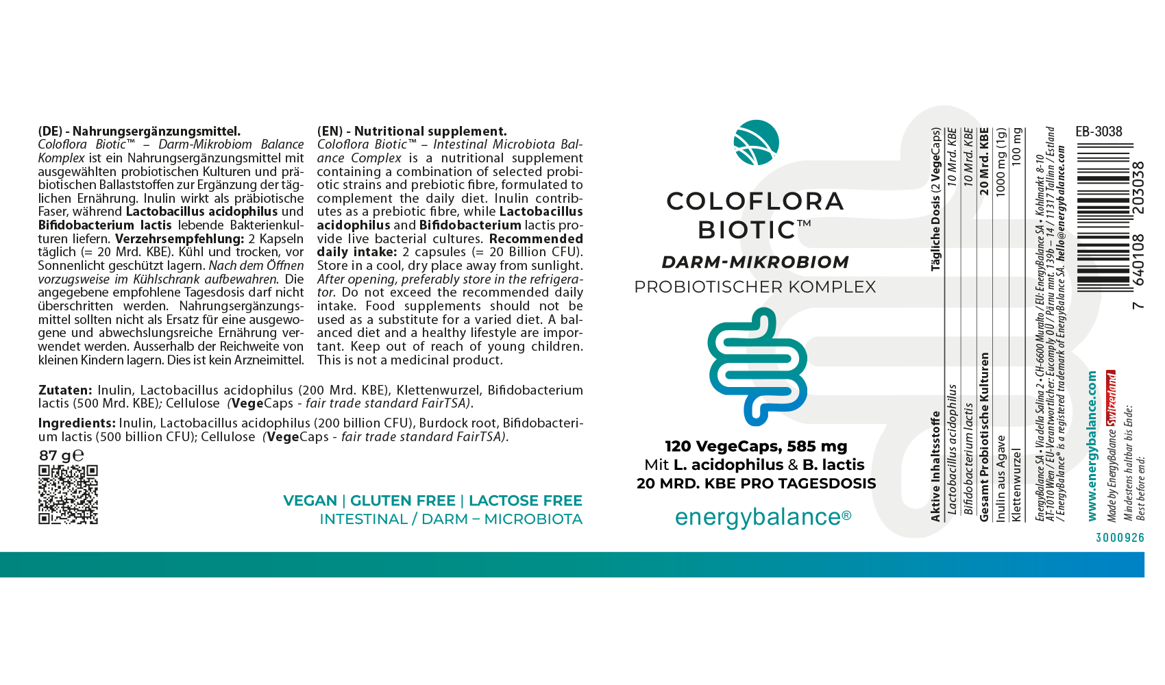 Coloflora Biotic di EnergyBalance® Svizzera è un integratore alimentare con probiotici per l’intestino, sviluppato per chi desidera una formula moderna, completa e ben dosata per l’equilibrio del microbioma intestinale. Ogni dose giornaliera da 2 capsule apporta 20 miliardi di colture probiotiche, abbinate a inulina e radice di bardana in un approccio 3-in-1.