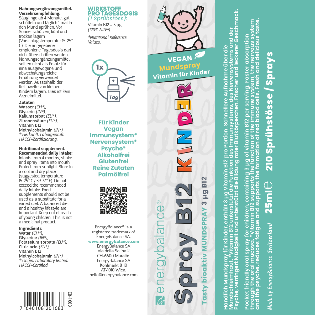 La nuova Vitamina B12 spray orale per bambini di EnergyBalance Svizzera è stata sviluppata per offrire un’integrazione semplice, sicura e adatta ai più piccoli. La formula è indicata a partire dai 4 mesi di vita ed è pensata per rispondere alle esigenze dei genitori che cercano un prodotto pratico da somministrare ogni giorno, ben tollerato e formulato con particolare attenzione alla qualità.