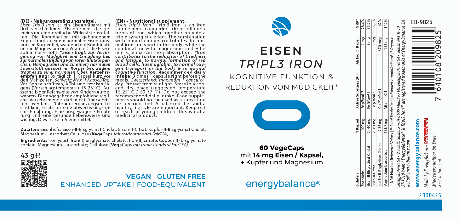 Eisen Tripl3 Iron ist ein Produkt in Schweizer Qualität, entwickelt von EnergyBalance® und in der Schweiz unter hohen Standards bei der Auswahl der Rohstoffe hergestellt.