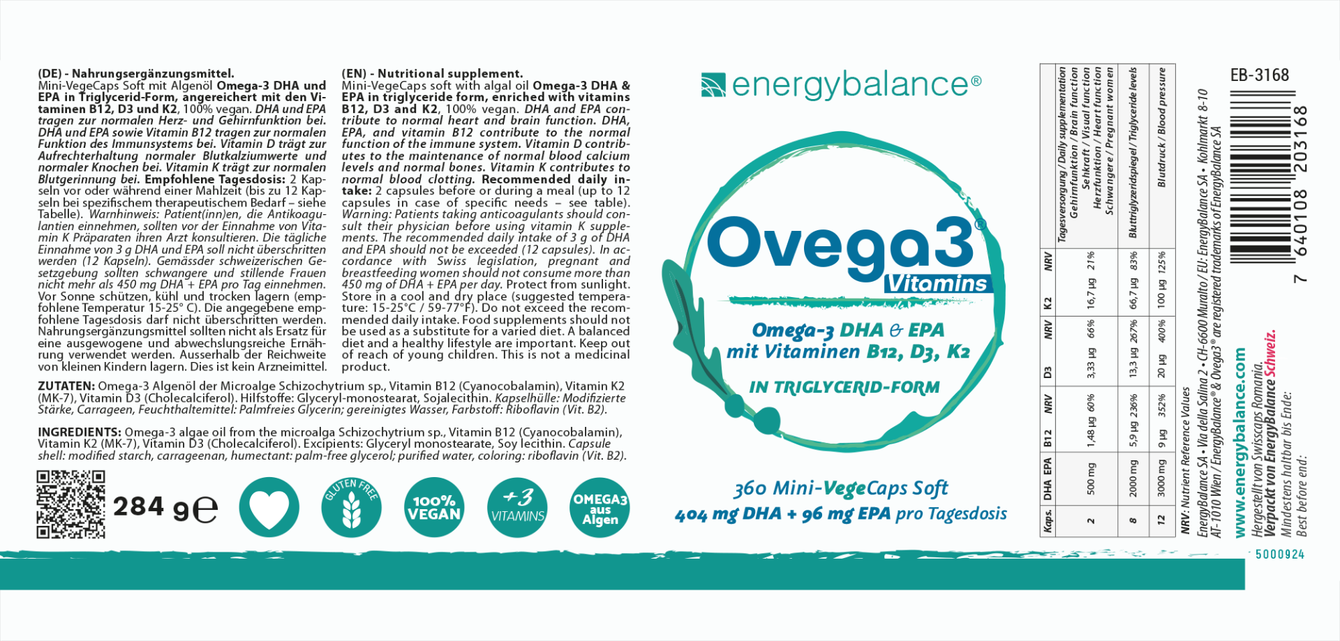 EnergyBalance® Switzerland festeggia 25 anni con un integratore unico e in edizione limitata: Omega-3 in forma TG da alghe con vitamine naturali, confezionati in blister e con scatola din cartole riciclato. Alta qualità svizzera dal 1999.