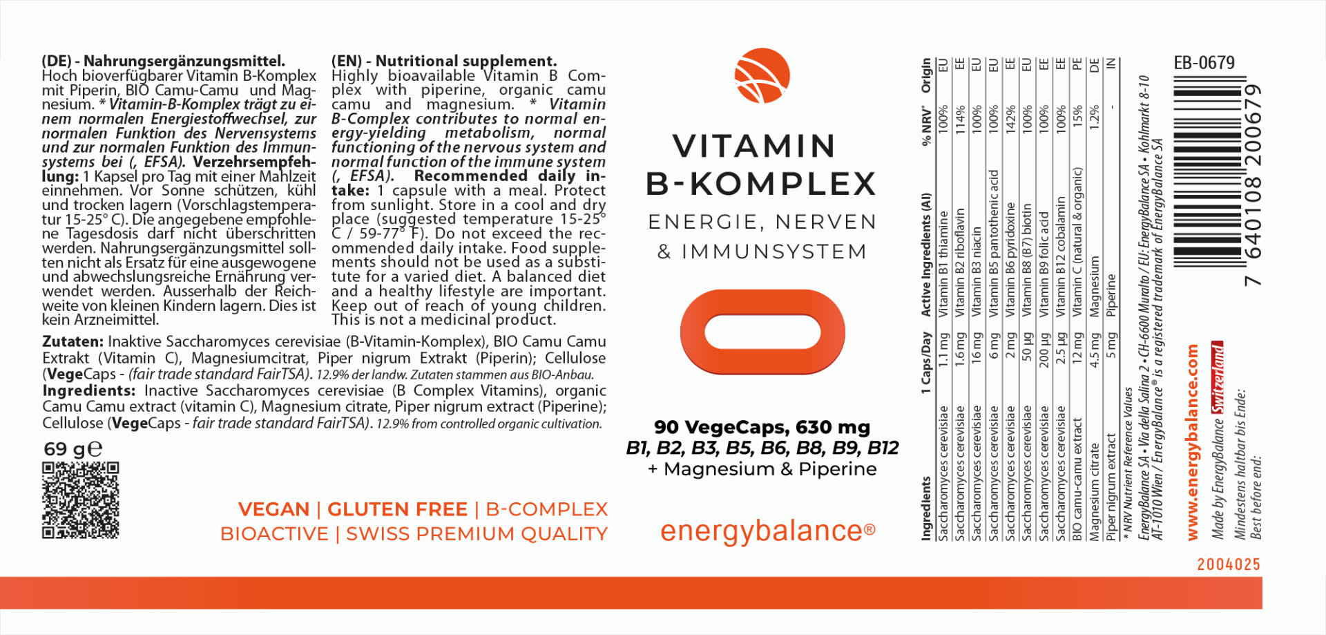 Vitamin B + Piperine di EnergyBalance® è un integratore di vitamine del gruppo B in forma altamente biodisponibile, veicolate in Saccharomyces cerevisiae inattivo, con aggiunta di piperina, Magnesio e Vitamina C da BIO camu camu. La matrice di lievito inattivo non è più enzimaticamente attiva e può essere utilizzata anche da chi evita i lieviti attivi.